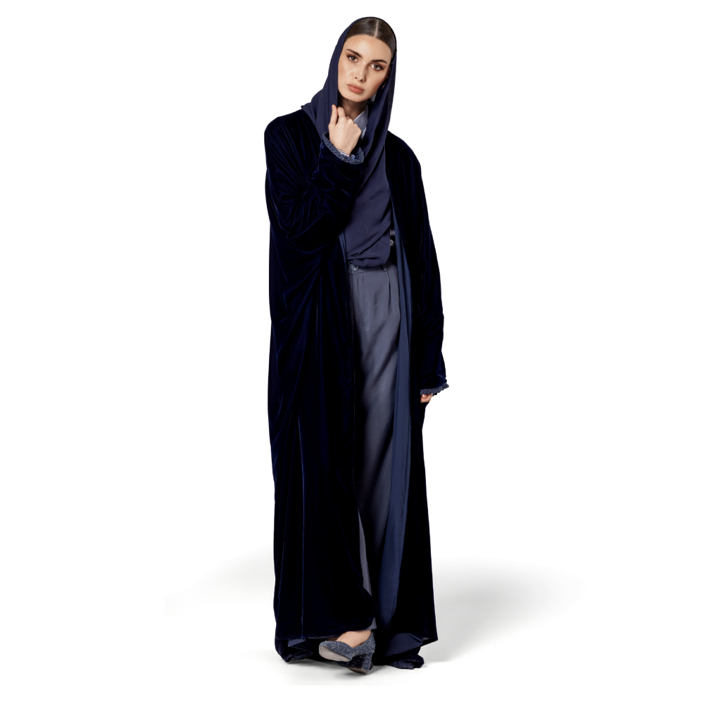 عباية بقماش المخمل الكوري بتصميم أنيق مستوحى من البشت، مزينة بتطريز صوف يدوي دقيق على الأكمام