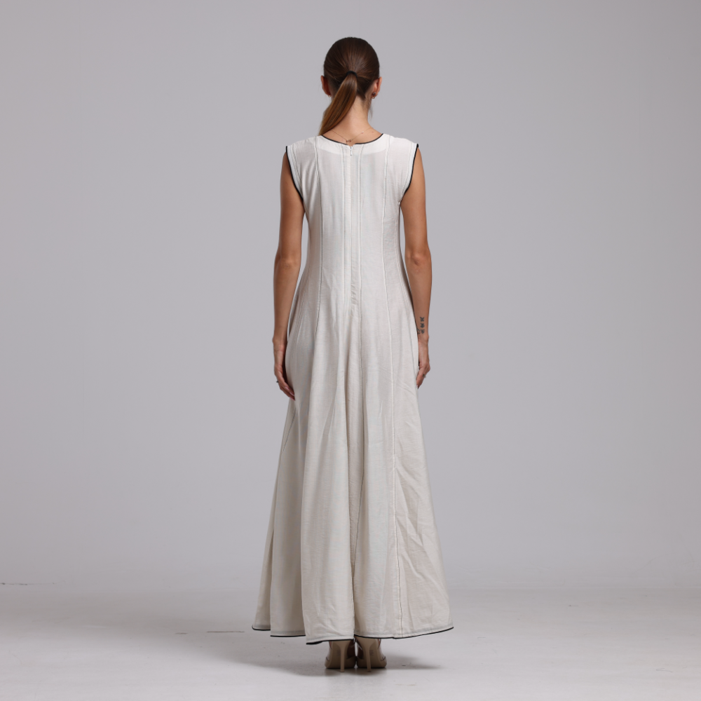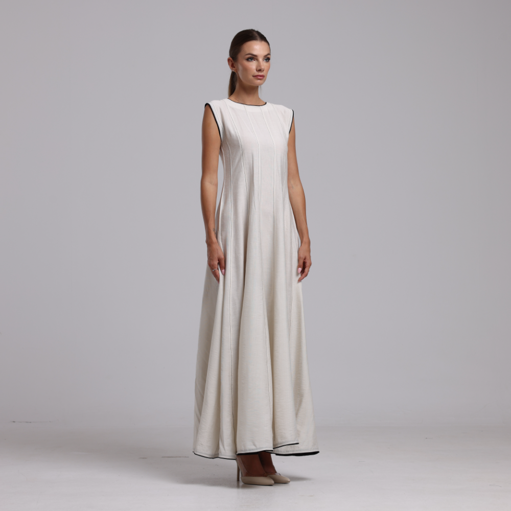 فستان بيج أنيق مصنوع من قماش اللينن ، يتميز بخطوط سوداء طولية رفيعة تضيف له طابعًا ناعمًا ومظهرًا مشدودًا.