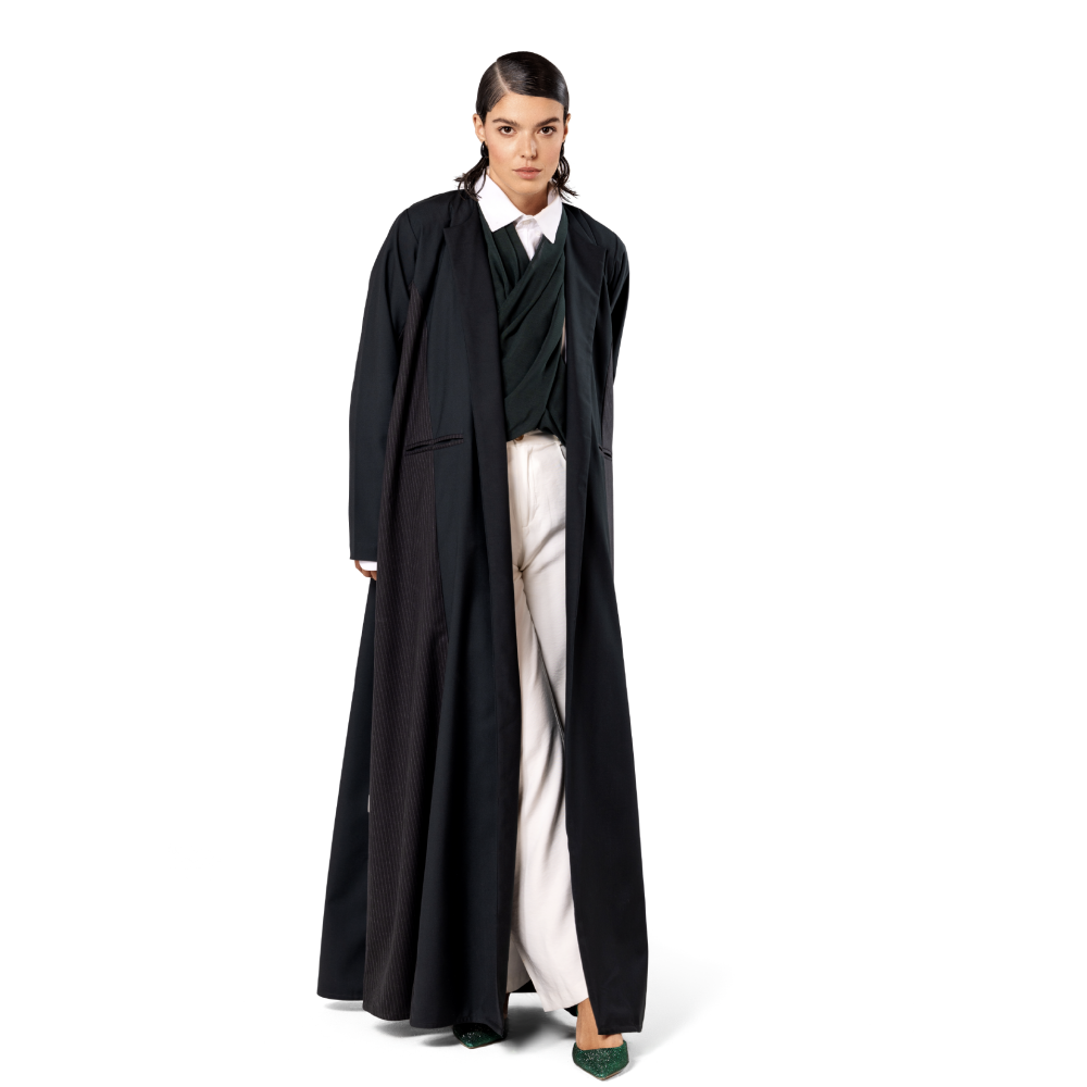 عباية جوخ ربيعي بتصميم أنيق ومريح وقصة دائرية من الأمام،، تجمع بين القماش السادة والمقلم. مع جيوب جانبية تمنحكِ الراحة والعملية.