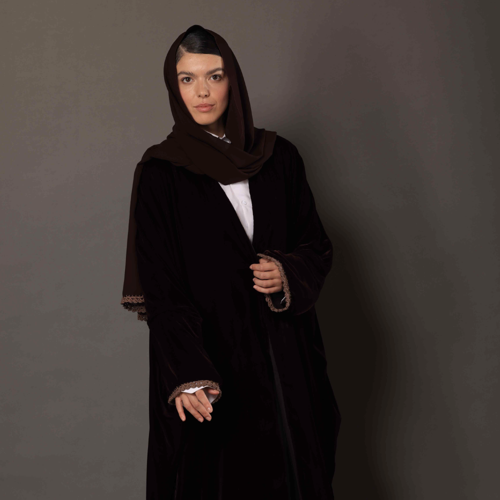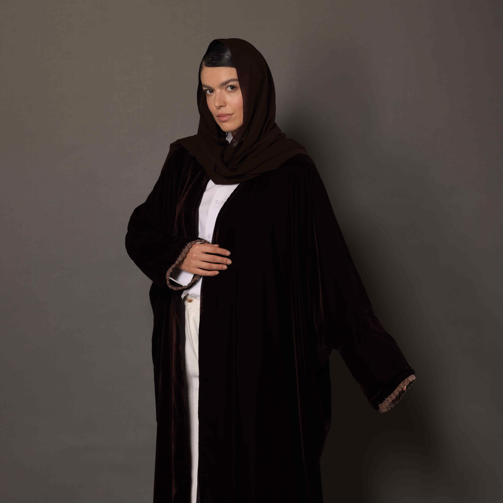 عباية بقماش المخمل الكوري بتصميم أنيق مستوحى من البشت، مزينة بتطريز صوف يدوي دقيق على الأكمام